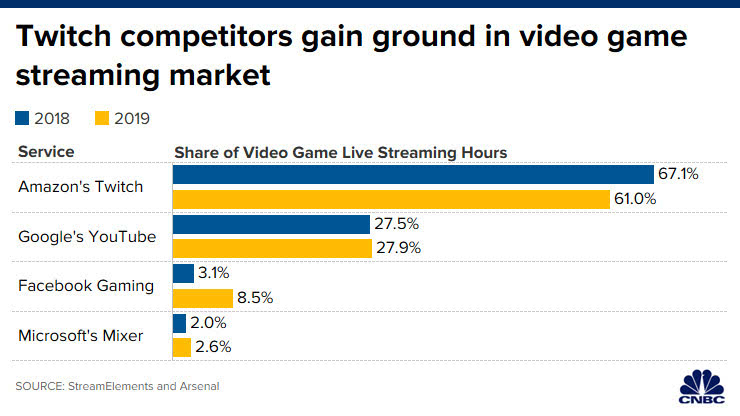 这些变化削弱了Twitch在游戏直播中的领先地位。游戏专业公司StreamElements和Arsenal.gg的数据显示,该公司在全球游戏直播时间的份额从2018年的67.1%降至2019年的61%。
