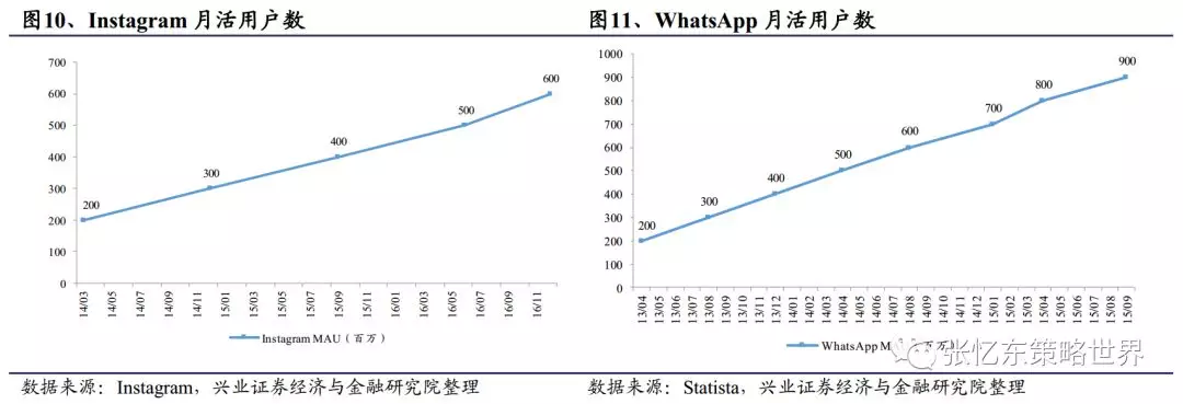 公司借助WhatsApp完善即时通讯功能:WhatsApp主攻打电话和发信息功能,纯粹走通讯工具路线,以简洁的特点深受用户欢迎。2016年1月WhatsApp宣布不再收取用户订阅费,将允许企业账户和用户直接沟通,与基于朋友间社交网络的Messenger形成优势互补,两者月活跃用户数均突破10亿。根据Bloomberg的估计,Messenger和WhatsApp分别以350亿、250亿美元的估值位列即时通讯领域第2、3位。