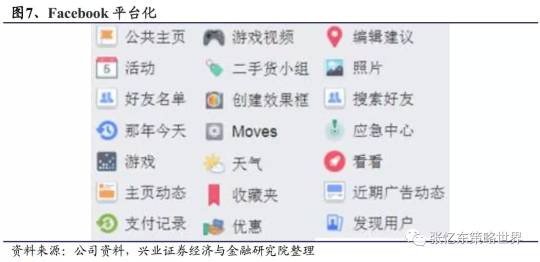 3)恰当时机逐步升级:Facebook于2006年即上线移动版网页,并与厂家合作在移动设备中预装了移动APP,预装即使在现在也是社交网络应用的重要获客方式。近年来Facebook顺应视频分享趋势,通过挖掘网红、购买音乐、直播版权加强原创视频的发展。同时,Facebook陆续测试以及上线照片、支付、订购食物等功能,显示其从社交媒体产品往平台化产品转变。此外,Facebook在满足用户多维度社交需求的过程中,逐步成为全球主要社交网络中唯一覆盖全社交体系的应用。