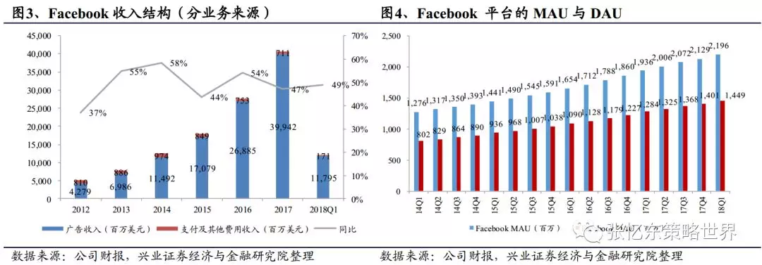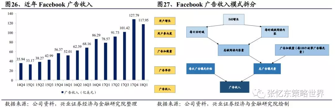 Facebook的广告收入受广告量、价格等因素影响快速上升。近年来,公司广告单价对广告收入的作用与日俱增,价格同比增长率逐步攀升。2018Q1广告收入同比增长50%,其中广告量同比增加9%,单价同比增长39%。单次曝光价格取决于广告投放效果等,广告曝光量即网页页面广告被浏览的次数,它受制于一个页面共有多少内容被阅读,以及这些内容中每100个故事内容承载的广告数量,即总被阅读内容和广告加载量。而被阅读量由每位日活跃用户浏览时间以及每段时间阅读内容决定。因此用户增长是撬动广告收入的源动力之一。