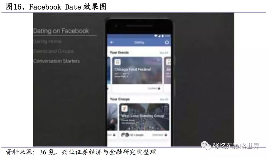 5)社交网络+约会:同年,Facebook宣布推出相亲婚恋应用Date,针对在Facebook上已建立弱联系的用户,以线下聚会方式形成强联系。Date用户可选择资料是否对特定的活动和聊天群开放,而对于在Facebook上标注“已婚”或者“恋爱中”的用户则无法使用该程序。消息公布当天,婚恋应用同行Match Group股价就暴跌23%,从侧面说明市场对拥有22亿月活用户的Facebook作为流量入口。