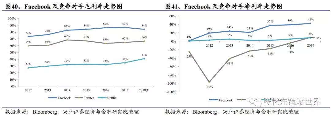 毛利率、净利率:由于腾讯(00700)、微博(WB.US)主营区域在中国,因此我们根据Bloomberg选取北美区两大竞争对手Twitter(TWTR.US)及Netflix(NFLX.US)做比较。很显然,Facebook无论是毛利率还是净利率都显著高于竞争对手。
