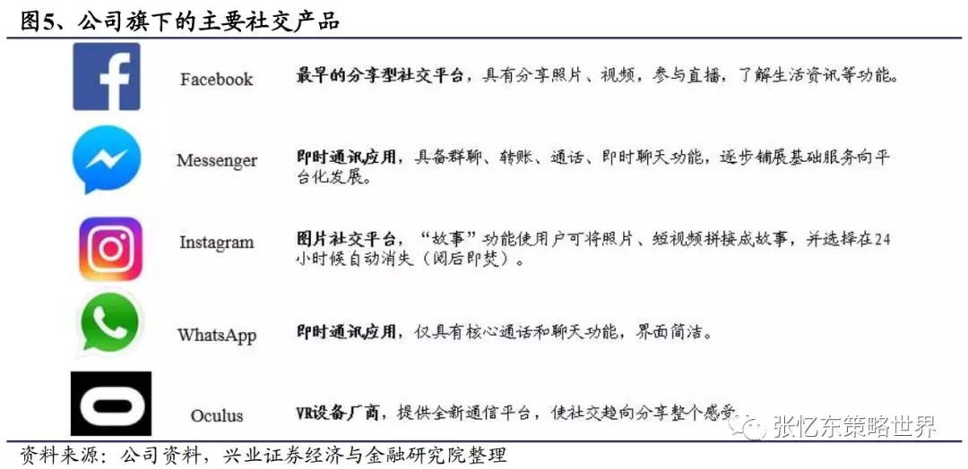 五大社交产品全方位布局生态圈。目前公司旗下有5大社交网络产品,分别为Facebook、Instagram、Messenger、WhatsApp及Oculus: