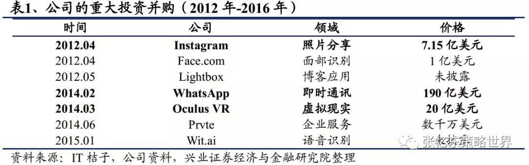 2012年公司以7.15亿美元收购Instagram,既使得用户分享形式趋于多元化,同时标志着公司从文字拓展到了图片时代,又遏制了竞争对手Snapchat在阅后即焚利基市场上的进攻。