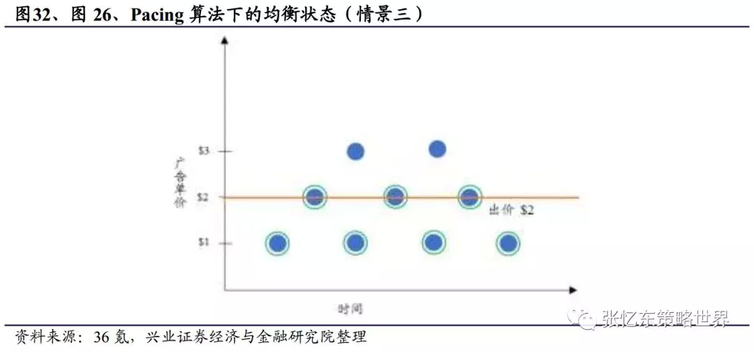 以下3种情形展示了Pacing算法为广告主带来的最大化价值,其中蓝点代表广告获得的展示机会,绿圈代表广告在竞争中赢得展示,红线代表出价高低。