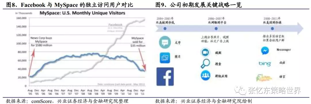 2004-2005年,Facebook从高校到全民:Facebook于2004年成立之初仅针对哈佛大学学生开放,用户需实名注册,上传照片及个人简介组成社交地图,界面非常简洁。后来逐渐推广到斯坦福、哥伦比亚等大学。在攻占各所高校的过程中,扎克伯格推出照片识别功能,将照片与社交完美结合,由此逐步渗透美国各年龄段用户层。