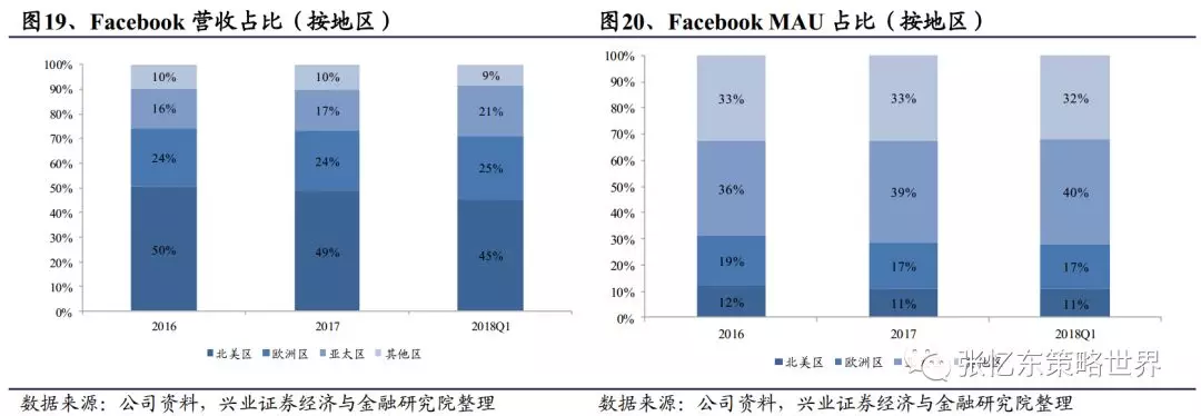 高增幅的用户群体:截至18Q1,Facebook全球范围MAU为22亿人,其中亚洲地区8.7亿排在首位,同比增长22%;美洲区虽然只有2.4亿,但ARPU高达23.6美元,是亚洲区的10 倍。全球用户参与度(DAU/MAU)连续3年保持在65%以上,各地区参与度也稳健增长。目前全球网民约35亿,Facebook在已有庞大用户群基础上,仍保持较大涨幅,在社交存量市场筑起坚实壁垒。