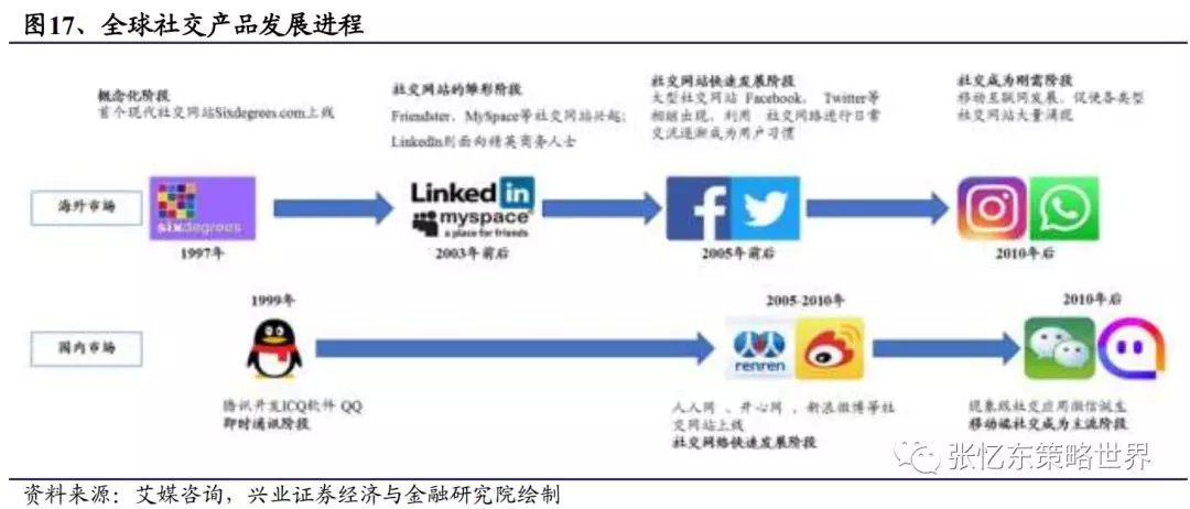 国内社交网络发展进程:1999年诞生的ICQ类软件腾讯QQ着眼于即时通讯领域,后来出现的提供私密好友圈动态分享的QQ空间,成为一时爆点。2005-2010年,人人网、开心网、新浪微博等社交网站上线,中国跟随海外进入了社交网络快速发展阶段。2010年后,现象及社交应用微信的诞生对人们早已习惯使用的QQ造成了一定冲击,标志着移动端社交成为主流阶段,陌陌等移动端社交APP出现。