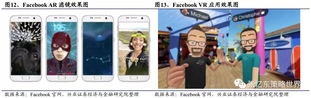 1)社交网络+AR:2017年Facebook发布基于手机摄像头的AR特效平台Camera Effects Platform,可绘制图像作为滤镜添加至Facebook相机,并根据相机的取景画面添加动态效果。而用户只需一部智能手机即可制作AR滤镜及分享AR体验。