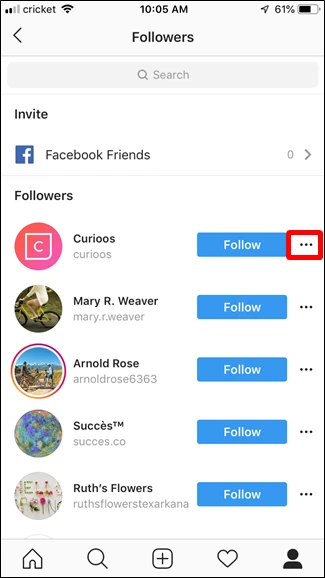 在“跟随”按钮旁边应该有三个小点。 点击该用户,然后点击删除以禁止该用户关注您。 Instagram甚至不会告诉他们他们已被删除。 谢谢,IG。