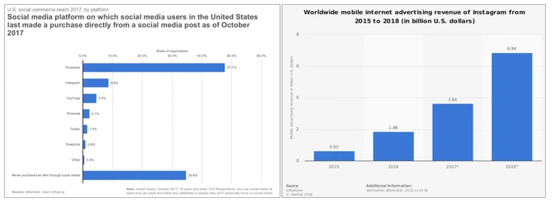 2017年10月eMarketer的调查显示,美国社交媒体用户通过各社交媒体凭条直接购买商品的分布比例如下方左表,其中Instagram位居Facebook之后的第二,虽然离母公司的Facebook差了很远,但比起竞品的“卖货能力”已经非常强(eMarketer数据)。