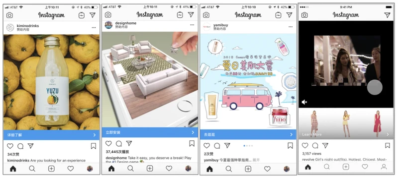 如下图,前三张从左至右依次为“照片广告”(正方形或横版的照片),“视频广告”(正方形或至多60秒的横版视频),“轮播广告”(单条广告中有更多照片/视频),“精品栏广告”(主题图+商品展示)。Feed流中的这些视频和图片广告会被标记为赞助内容,用户可以滑动查看广告主发布的多个图片/视频,也可以直接点击链接跳转到官网。
