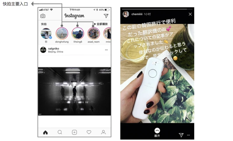 - 复制竞争对手Snapchat的阅后即焚和快拍模式,满足了原有的Feed流动态无法满足的用户需求,比Snapchat更加具备多元性,内容也更加美观、优质。