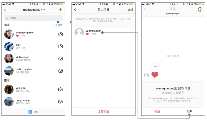 2.订阅关系:只有一方关注另一方,是单纯的“关注”与“被关注”的关系,本质是“订阅”。比如,当未关注的人给自己发消息时,用户会在Direct消息里收到请求,点击可查看陌生消息,此时可以选择拒绝或允许(如下图)。当选择允许,发送消息的一方可以查看到自己发送的消息显示“已读”状态;如果选择拒绝,发送消息的一方不会收到任何的通知,也不会看到自己发送的消息显示“已读”状态。
