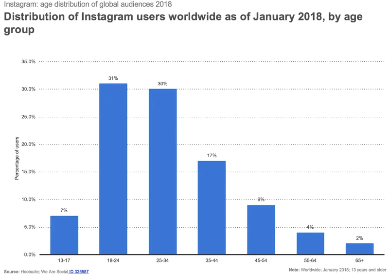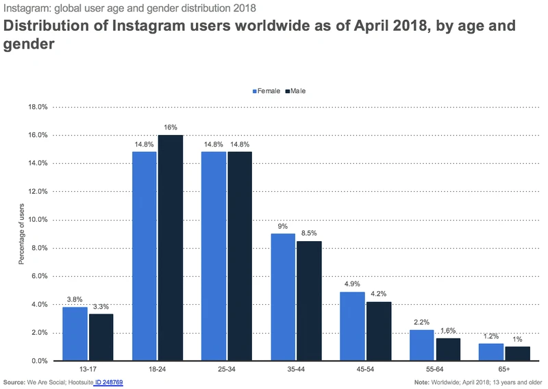 截至2018年1月,用户年龄分布如下表:35岁以下的用户占比68%,其中35岁以下的成年人占比高达61%,因此Instagram的受众偏年轻化。