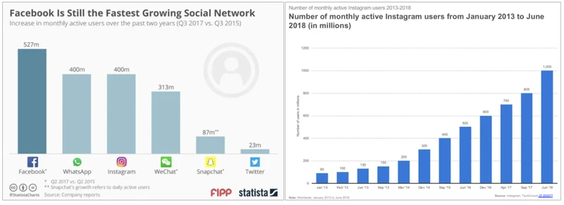 从2015到2017年间的月活增长值来看,Facebook是增长最快的,WhatsApp和Instagram位居第二(下方左表)。