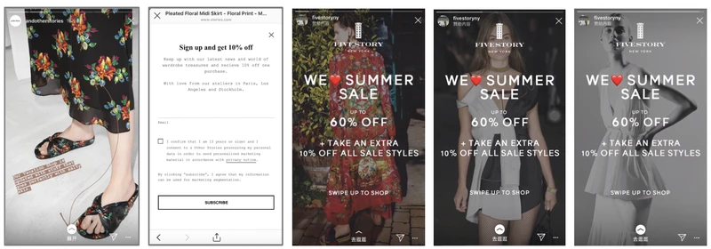 品牌自己通过快拍来发布广告,快拍广告下方可以拉出品牌官网的链接。这种广告分为静态图片快拍广告(如下方左侧两张图)和轮播图片快拍广告(如下方右侧三张图)。2017年1月数据显示,1/3的热门快拍来自商家(Instagram内部数据)。