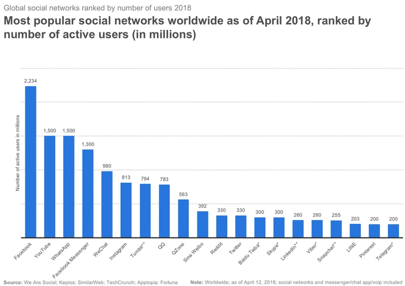 2018年4月,根据月活跃用户数量进行排序,全球社交媒体排名位于前三位的平台分别为Facebook,YouTube和WhatsApp,Instagram排名位于第六。