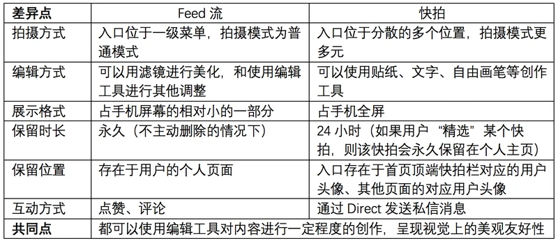 由以上诸多差异可见,快拍和Feed流的“生产创作”过程体现了两者定位的不同,Feed流的内容将偏向于更加正式、“严肃”,而快拍的内容则偏向于好玩、即兴,更多的是反映关注人/好友在当下/实时/或当天最近一段时间内的动态。