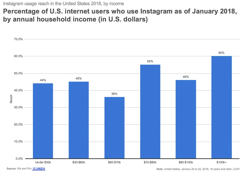 用户的收入和教育水平都相对较高。以美国地区用户为例:家庭年收入最高(10w+)的用户中,60%的人使用Instagram(PS:美国家庭年收入中位数为$57,671)。