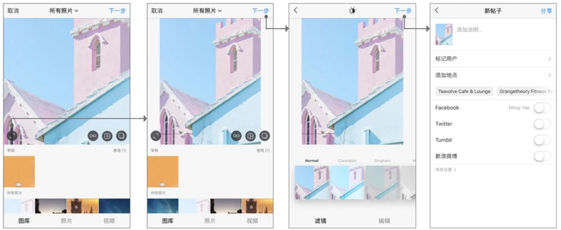 拍摄功能与滤镜等编辑功能是Instagram的核心功能。在不断丰富产品的功能的时候,也在不断加强产品的核心功能。简单来说,用户可以使用Instagram的内置相机拍摄照片或视频,使用滤镜及其它创作工具来编辑所拍摄的内容。用户完成编辑后,即可把内容发布在Feed流“动态”,也可以分享到其它社交平台。