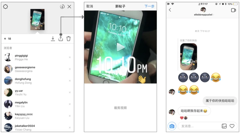 浏览他人发布的快拍后,对方可以查看到浏览过快拍的用户名单。快拍中发布者与观看者间的互动方式不是通过常见的点赞、评论,而是通过观看者发送私密的Direct消息与发帖人进行非公开的互动。