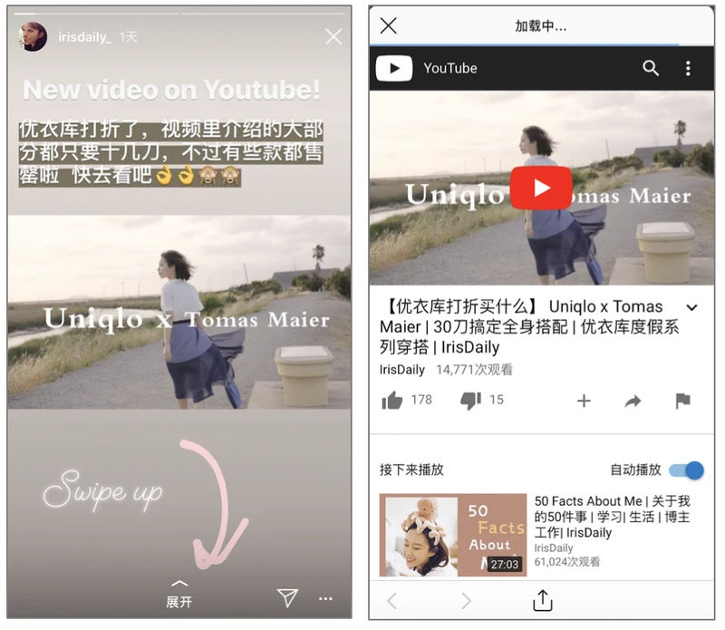 品牌也可以通过与有认证账户的KOL合作,植入品牌广告。经过官方认证的账户在快拍中,可以设置上滑页面添加第三方外链,用户通过点击或向上滑动即可进入品牌设置的网站页面(如下图,点击展开或上滑即可查看博主的长视频,但视频是发布在Instagram的竞争者YouTube上面。未来Instagram很可能会鼓励发布者提供直接跳转到IGTV观看长视频的链接)。
