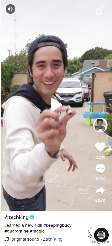 前三名是@zachking。他是一位来自美国的男人,喜欢分享有趣的视频。他以4,300万名球迷和4.7亿个点赞位居前三名。