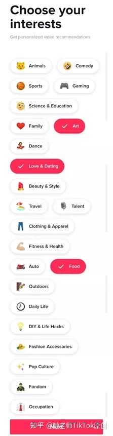 先给你看一张图片,这是注册tk账号一开始的时候进行的分类选项,之前有在文章跟大家分享,这些选项的选择能给你增加定向流量,后续刷相关的内容视频,对相关视频点赞评论,也会同样增加对应内容官方的推送。