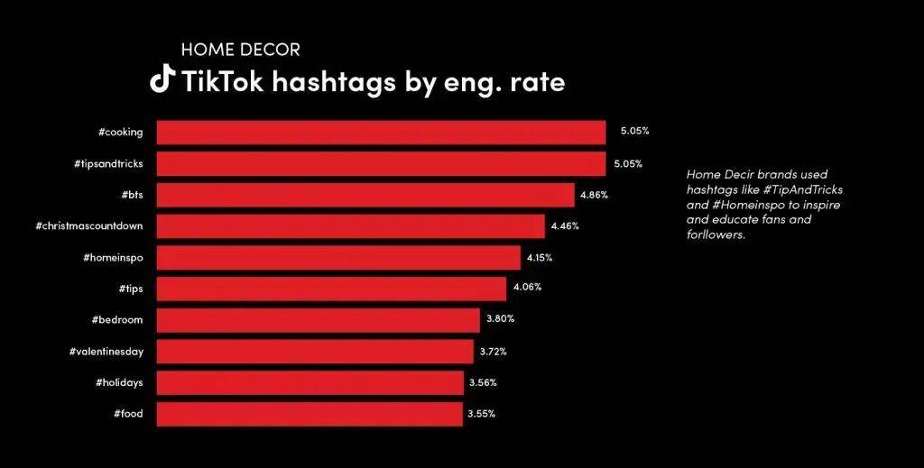 查看整个行业的现状,我们不难发现,家居装饰品牌一直都在Facebook、Instagram和Twitter等社媒平台上与粉丝积极互动,但目前参与率还不算高,不过,他们在TikTok上的表现可圈可点,像#TipsAndTricks标签就有597亿的浏览量,#HomeInspo也有48亿的浏览量。