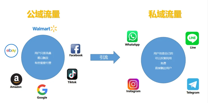 可能有的同学还不太了解公域和私域流量的区别,举个例子,像亚马逊、Ebay、TikTok这些都是属于平台流量,是公共的。你可以在里面发布内容,免费获取用户,甚至是付费,例如百度、Google、Facebook,如果你想要自己的内容排到前面,就需要付费去做竞价排名。