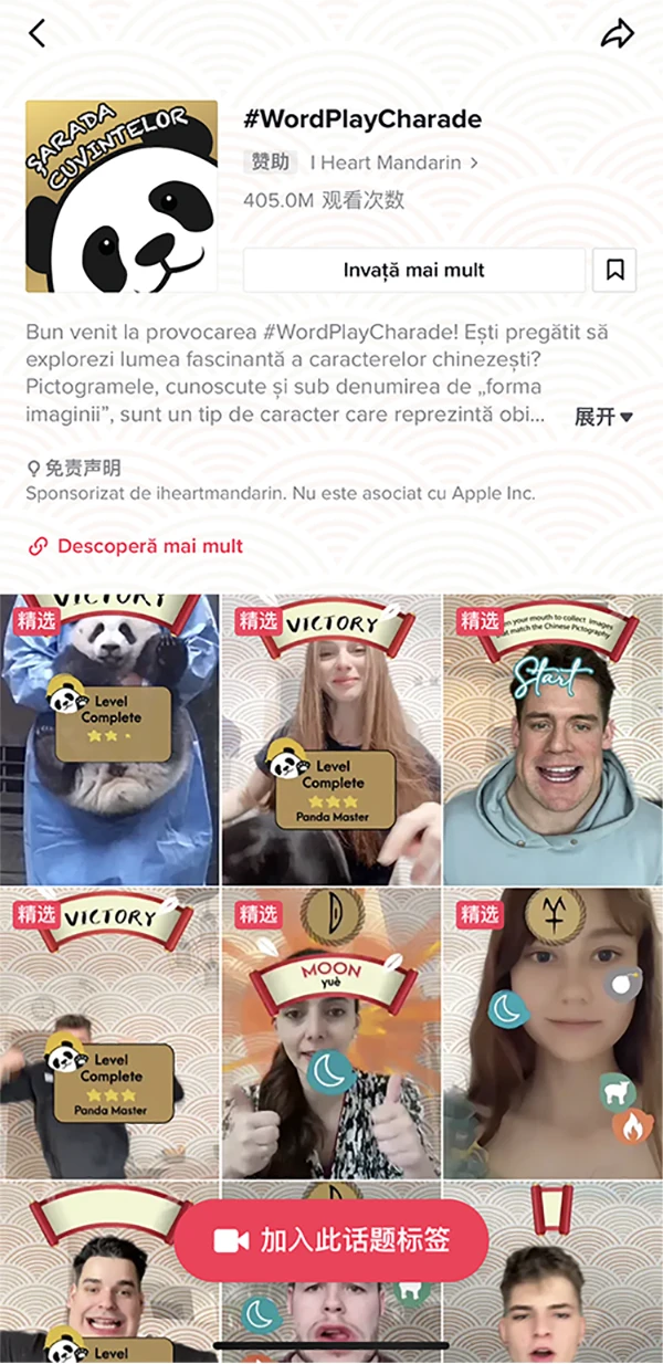 汉字是象形文字。对于中文学习者来说,了解汉字背后的象形意义,能够激发中文学习兴趣。“中文星”在TikTok平台,以#WordPlayCharade为话题,邀请全球用户共同参与通关类滤镜游戏。玩家通过系统所提供的象形字,找出与之最相近的图形,猜测该象形字对应的涵义。“趣味”的音乐,搭配颇具挑战性的游戏模式,吸引了无数海外网友参与,激发起他们对汉字的浓厚兴趣。