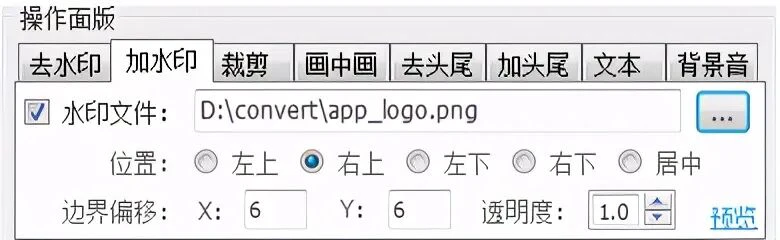 加水印此功能可以为视频加上音乐 Logo 标记,支持静态图片及 gif 动图。