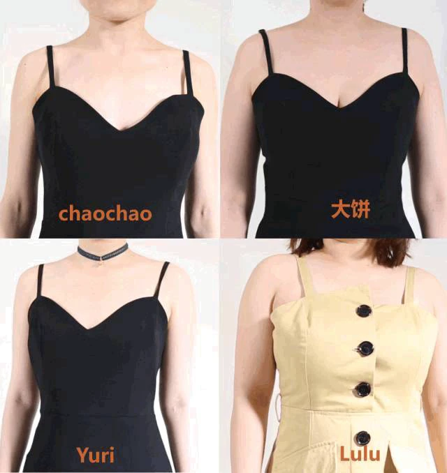 吊带裙的领型分很多种,有平领,V 领,M 领,还有U 领,关于它们的选择跟许多因素有关,比如脸和脖子的身型特点,不过我们这里集中讨论的是胸部大小的影响。