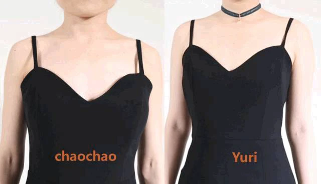 窄肩匀称身型代表 chaochao 示范:肩带靠中间凸显肩部(左图及右图左侧),肩带靠两侧会看起来没肩(右图的右侧)。