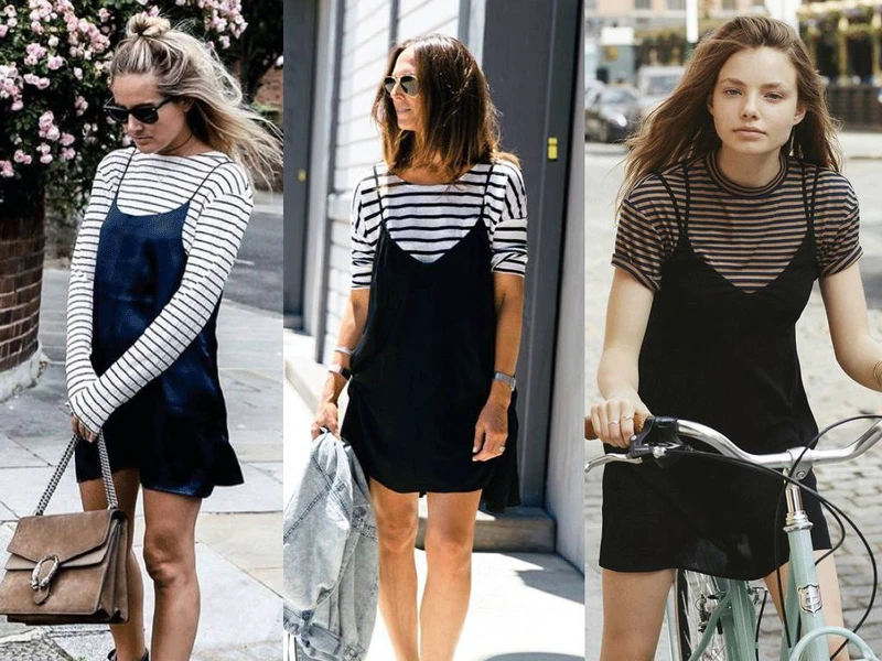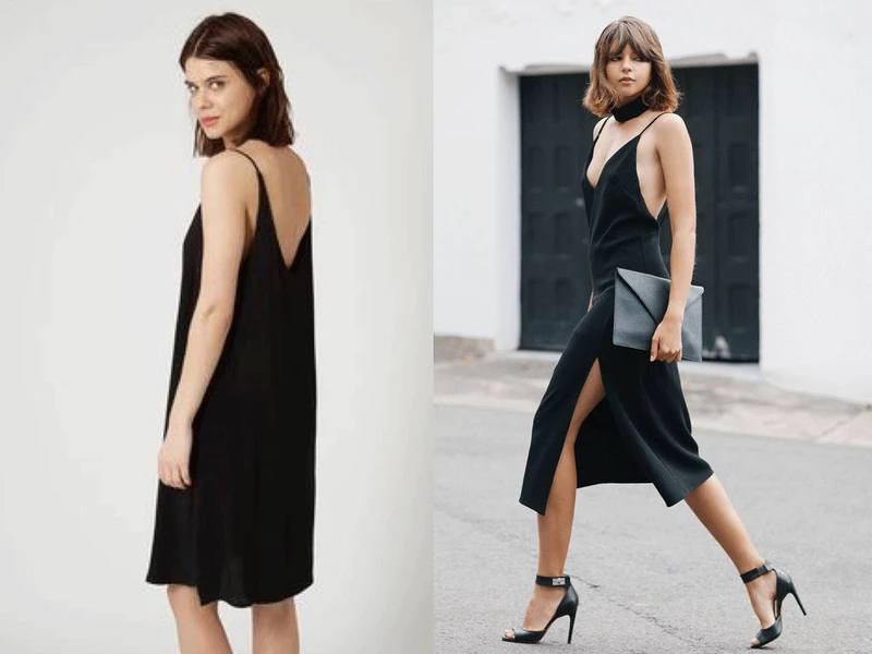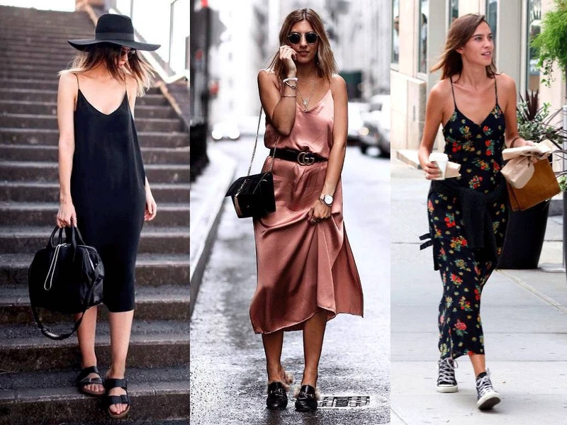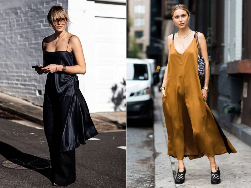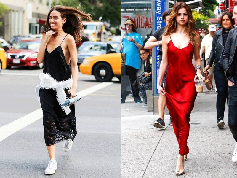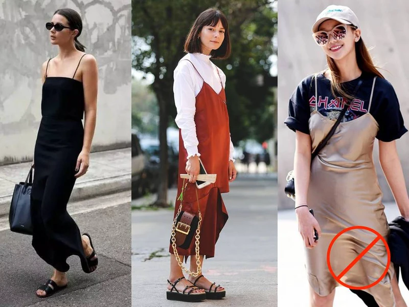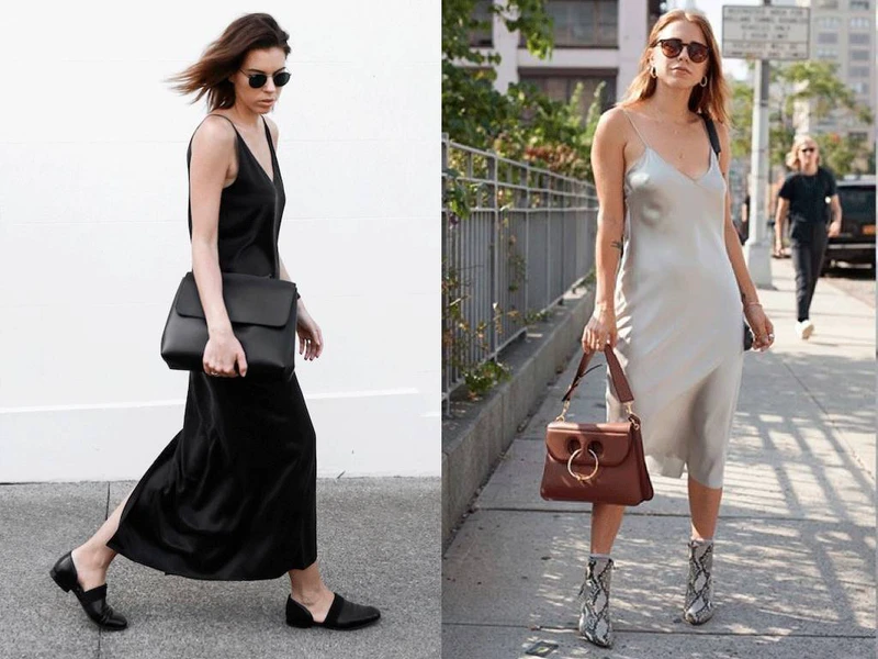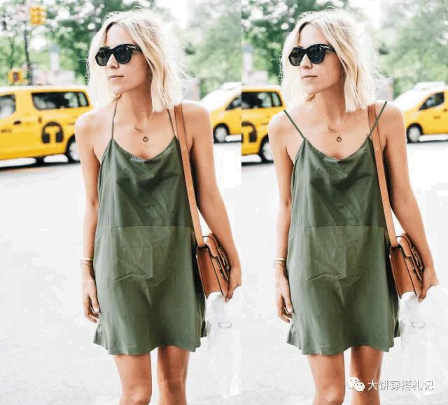这个办法也有弊端,就是对身材丰满的人不太友好。下图的对比也能看出来,右边的吊带裙同样搭配了帅气的鞋子包包,可是看起来还是很「睡衣」。