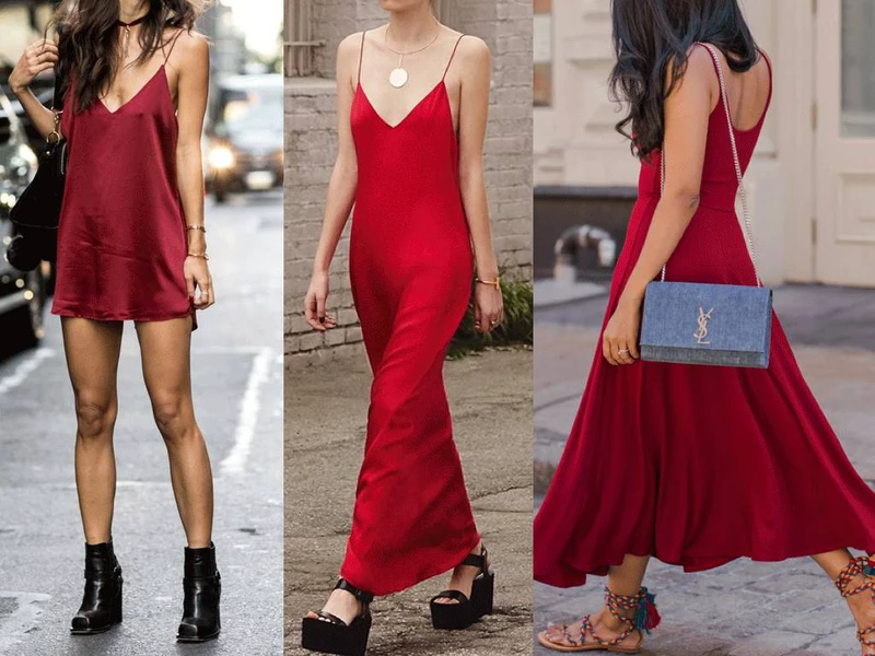 吊带裙首先的区别在于肩带粗细。一般像 slip dress 这样性感挂的都是细肩带,用一根线就能勾起无限幻想。宽肩带的吊带裙虽然性感度弱了点,但因为它能遮住 bra 肩带,所以从实用性来说略胜一筹~